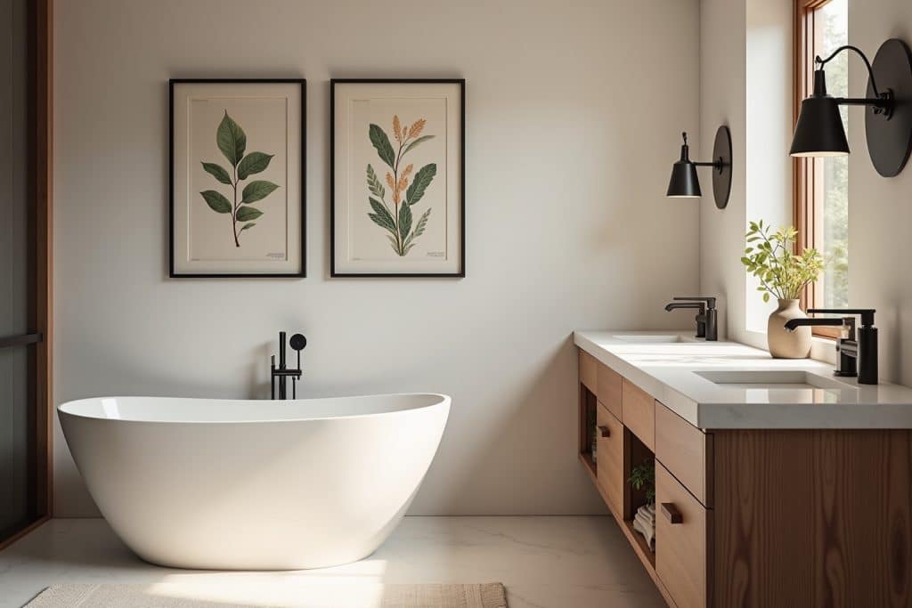 - Einzelbild: Ein einzelnes, gut platziertes Wandbild kann zum Blickfang im Raum werden. Platziere es beispielsweise über dem Waschbecken oder gegenüber der Tür, um die Aufmerksamkeit deiner Gäste zu fangen.